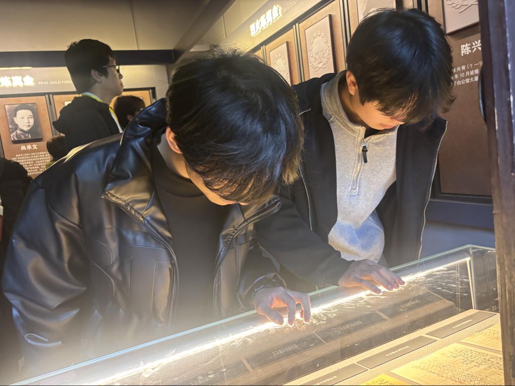 随后,先锋队员们前往渣滓洞集中营。斑驳的铁丝网、冰冷的铁窗、狭小的牢房,无声诉说着革命志士的坚贞不屈。先锋队员们认真观看大屏上江竹筠、许建业等烈士的英勇事迹,凝视着牢房墙上“为了免除下一代的苦难,我愿把这牢底坐穿”的革命诗句,仿佛穿越回那段烽火岁月。泛黄的手稿、锈迹斑斑的刑具,让先锋队员们深切体会到革命先辈在绝境中坚守信仰的钢铁意志。