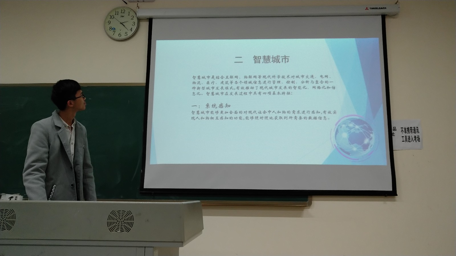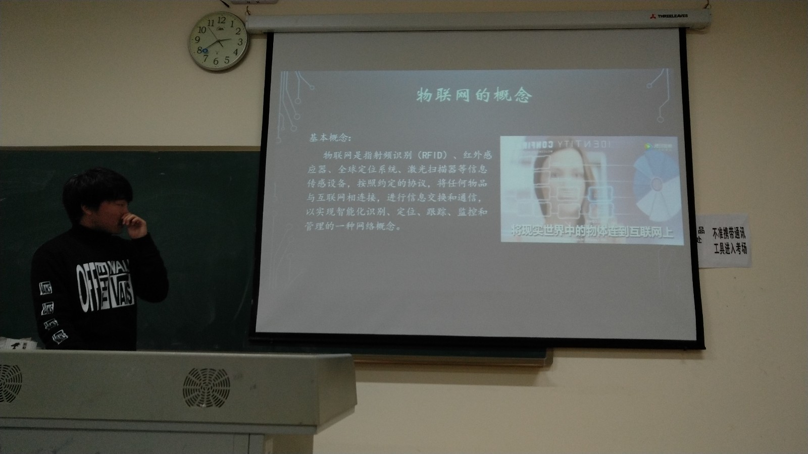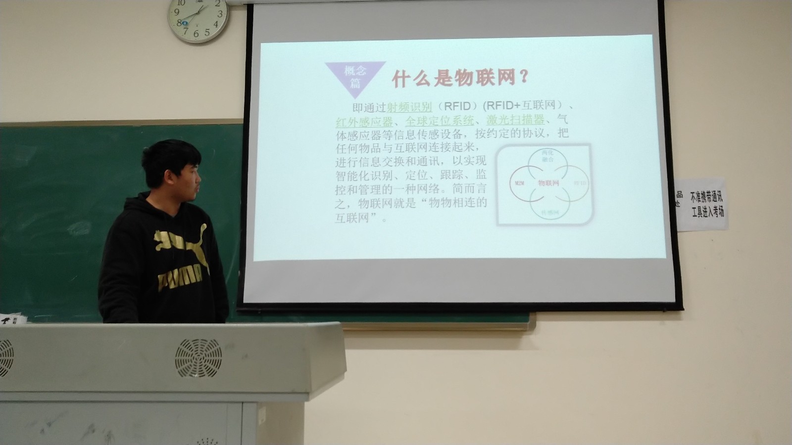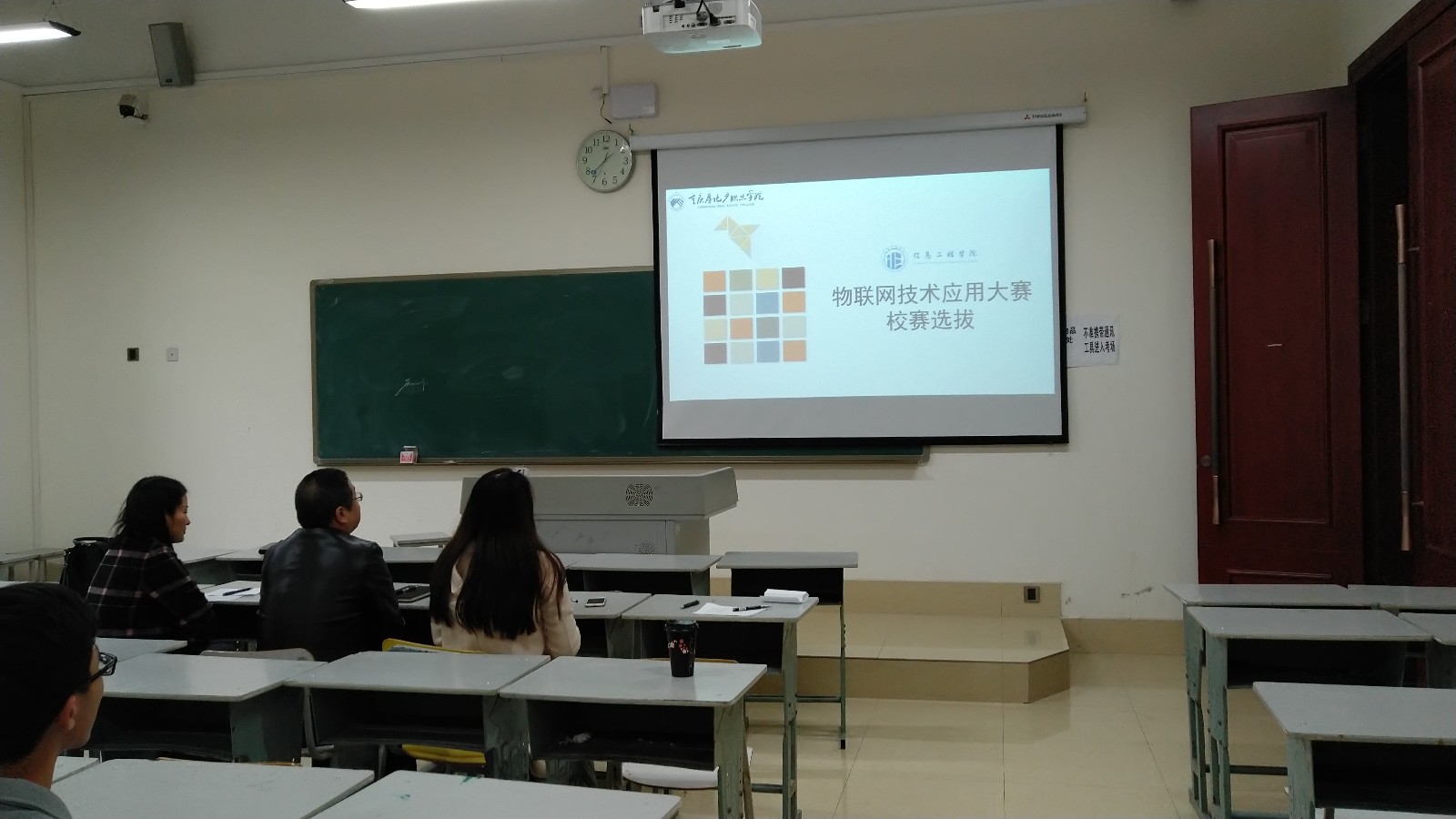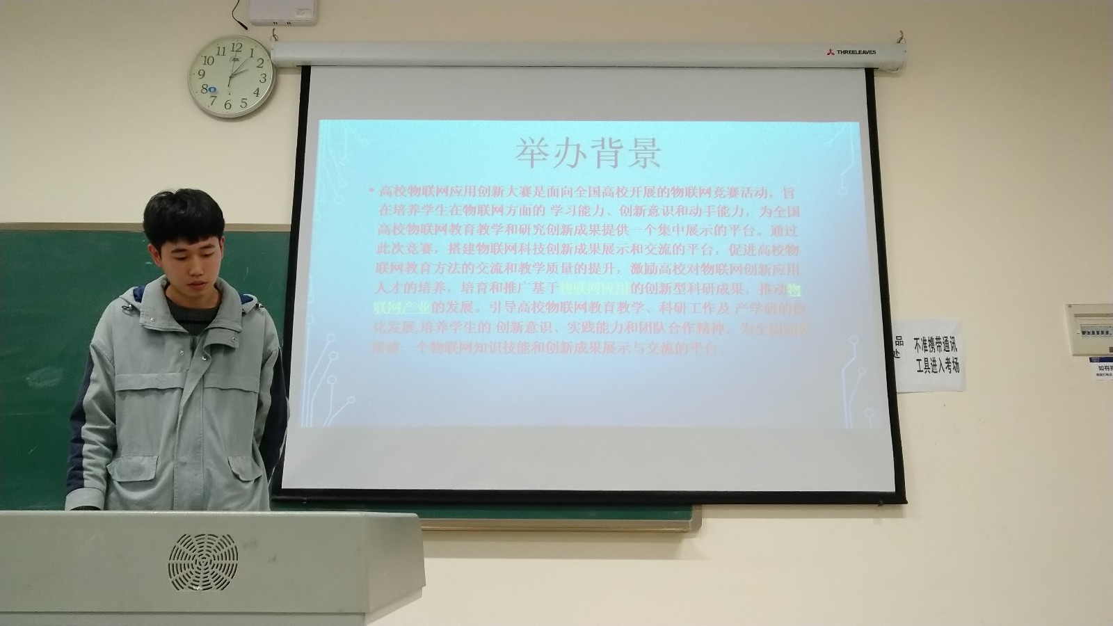 在全国职业院校技能大赛举办前,为了选拔参赛人员,并帮助同学们及时查缺补漏,在经过了积极的宣传动员后,信息工程学院物联网应用技术教研室于2018年11月16日13:30-15:30组织报名学生在笃学楼3507教室开展了物联网技术应用大赛校赛的选拔活动。会上教研室主任宣布了参加评选的各位评委老师和比赛要求、评分细则等内容,并要求每组派代表上来抽签,根据抽签结果依次进行宣讲。参加竞赛的12名学生分成四队,都认真宣讲准备好的内容,评委老师也根据表现认真打分,整个校赛活动圆满完成。