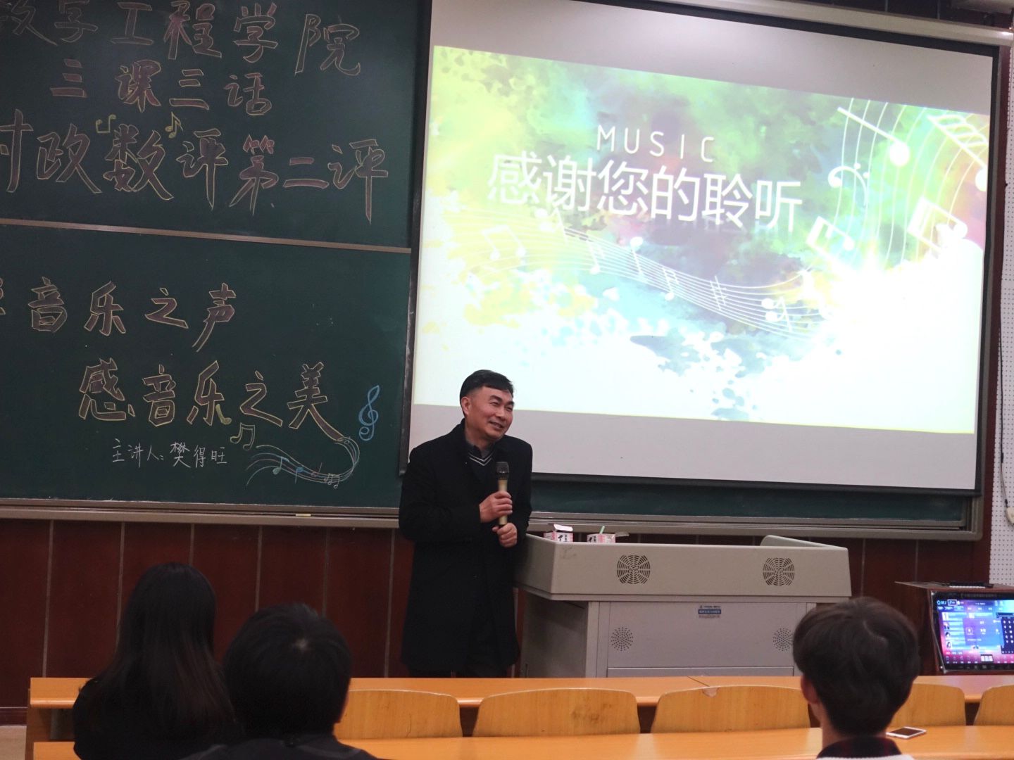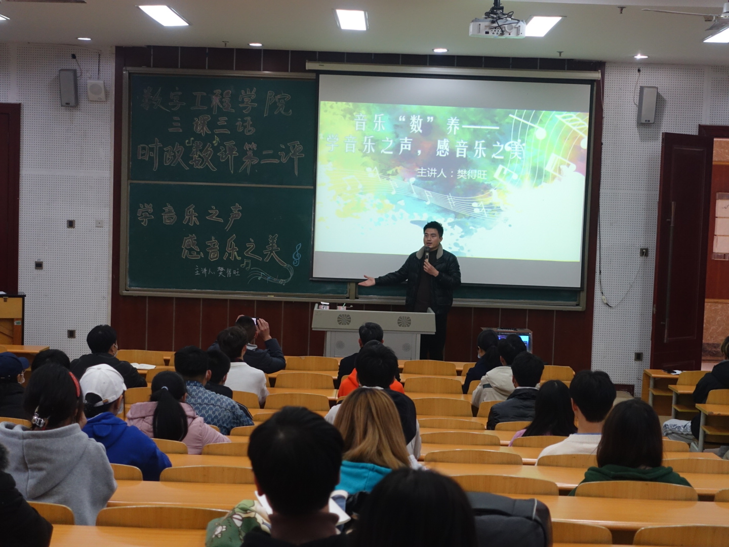 为提升我院学生艺术素养及丰富课余生活,推广、落实、落细beat365“三课三话”专题教育,构建数字工程学院全员、全程、全方位育人工作体系。2021年11月10日17:00,我院在笃学楼2205开展艺术“数”养第一讲:“学音之声,感乐之美”讲座,本次讲座由数字工程学院团总支书记樊得旺老师主讲,学工部部长冉小平、数字工程学院院长唐国坪、数字工程学院党支部书记张运来、校团委程茜老师、数字工程学院综合办公室主任钟琴、全体辅导员及50名学生代表共同参与。