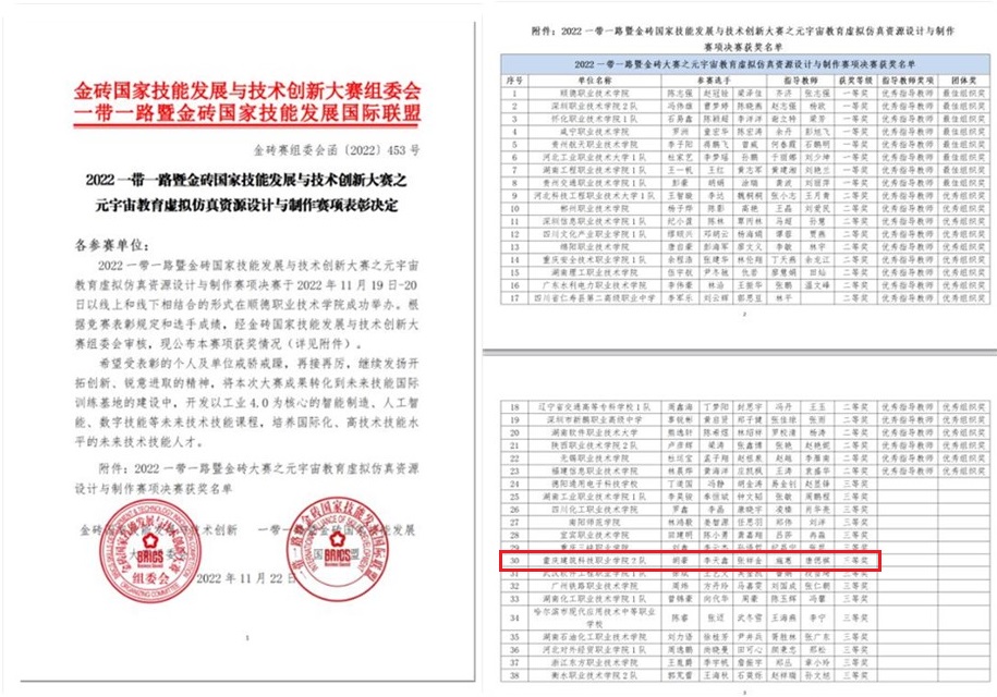 11月20日,2022一带一路暨金砖国家技能发展与技术创新大赛之元宇宙教育虚拟仿真资源设计与制作赛受疫情影响不能在线下开展,但是排除障碍,如期在线上成功举办。本次比赛由施惠与唐偲祺两位老师带队,带领2队6人小组,胡悦、梁灏、杨萧、胡豪,李天鑫,张祥金六位同学参与比赛,在指导教师的精心指导下,披荆斩棘,在全国52所院校76支参赛队伍中,荣获团体三等奖。