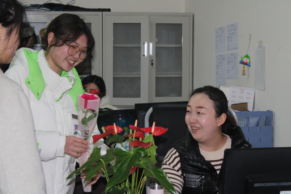 “这一天,她们是被鲜花和幸福包围的一天!”为让数字工程学院默默付出的女老师们享受到女神的幸福和快乐,感受到来自同学们的关心和问候。数字工程学院团总支·学生会于当天上午便早早守候在3513办公室,为每位女神送上鲜花和祝福。愿她们能领略流金岁月里的温柔芬芳,也能成为自己火热世界里的女王。鲜花和笑脸交相辉映,烘托出温馨祥和的节日氛围。一支花朵一份爱,一份祝福一份情。