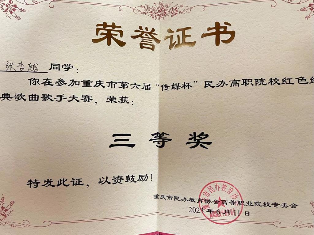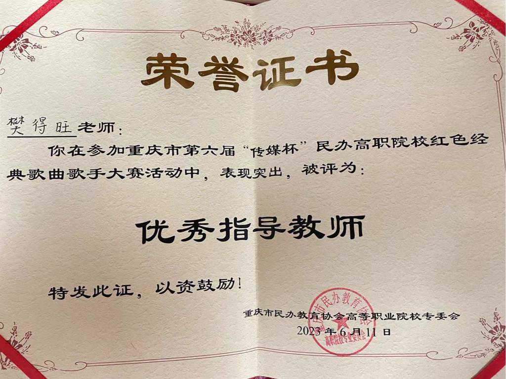 经过樊得旺老师的精心指导、参赛同学的刻苦训练。最终,张杏越同学在此次第六届“传媒杯”民办高职院校红色经典歌曲歌声大赛中荣获三等奖、樊得旺老师获“优秀指导教师”的殊荣!