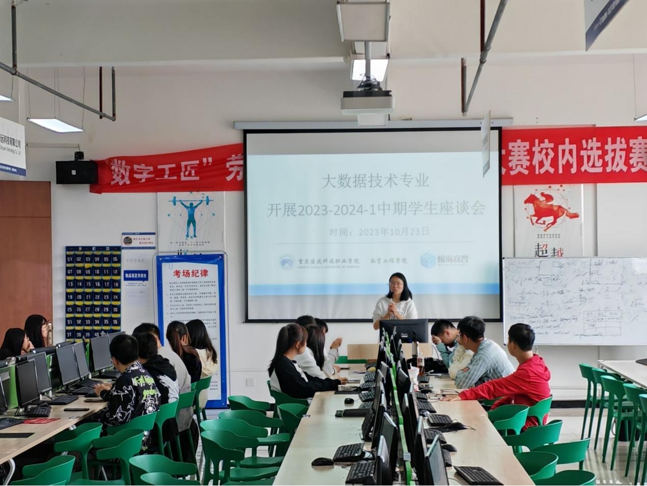 2023年10月23日中午12点30分,大数据技术专业在信息馆X406开展了2023-2024-1中期学生座谈会,本次会议由大数据技术教研室主任廖国敏主持,参会人员为21级、22级、23级大数据技术专业各班级的学生代表。