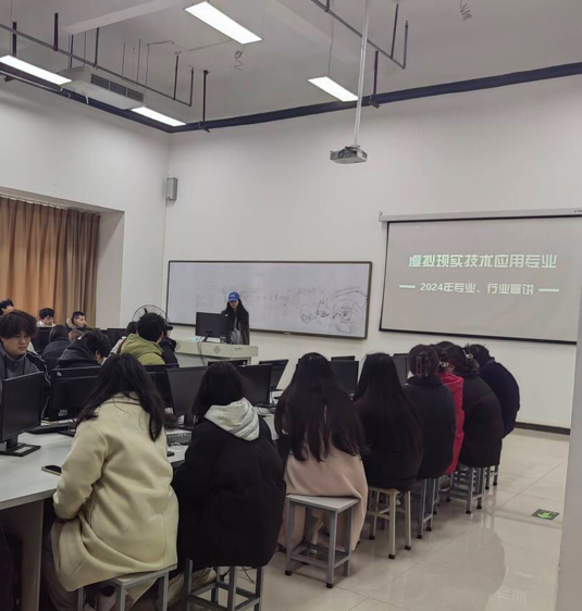 2024年2月28日上午,在学校科技楼X302和X203,虚拟现实技术专业针对2022级虚拟现实技术应用专业和2023级虚拟现实技术应用专业的同学进行了虚拟现实技术应用创业的相关宣讲。包括专业介绍,行业介绍,专升本资讯,创业类比赛和专业比赛的信息等相关介绍。
