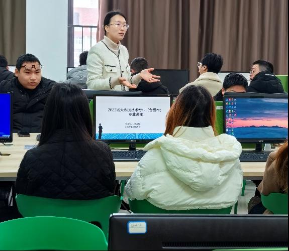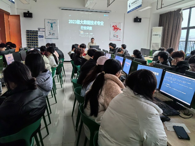 给学生们做了精彩的行业专题讲座之后,2月28日上午10:40-12:10,大数据技术教研室全体教师在大数据实训中心分别给各个班级做了专业讲座。首先是让同学们更加熟悉和了解各个任课教师,其次主要是向23级同学分享课程体系、竞赛、专升本、职业技能等级证书考取、转段考核等方面的内容,向22级同学分享本学期课程的重要性、专升本、职业技能等级证书考取、实习、就业、转段考核等方面的内容。