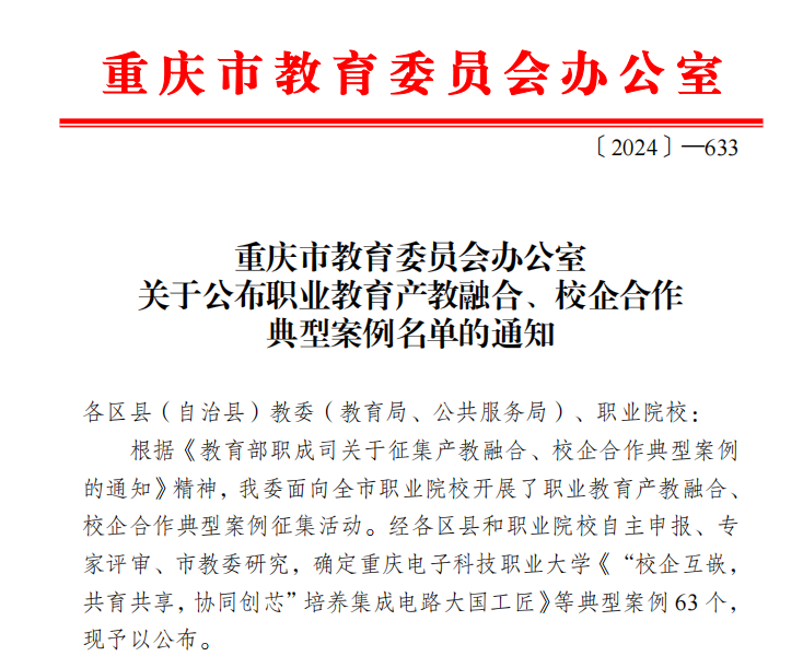 2024年11月13日,数字工程学院的产教融合项目“打造产教融合智慧教育体系,数智赋能数字技术工匠培养”荣获重庆市教育委员会办公室公布的职业教育产教融合、校企合作典型案例,标志着我院在职业教育领域的创新实践获得官方高度认可。