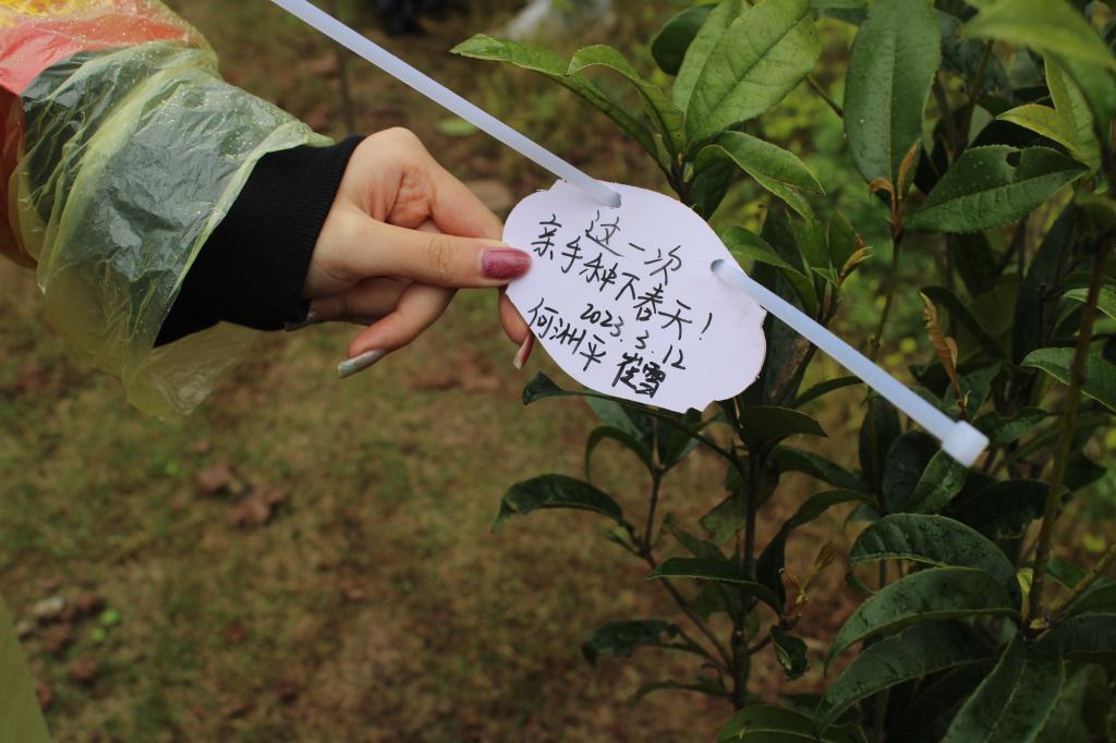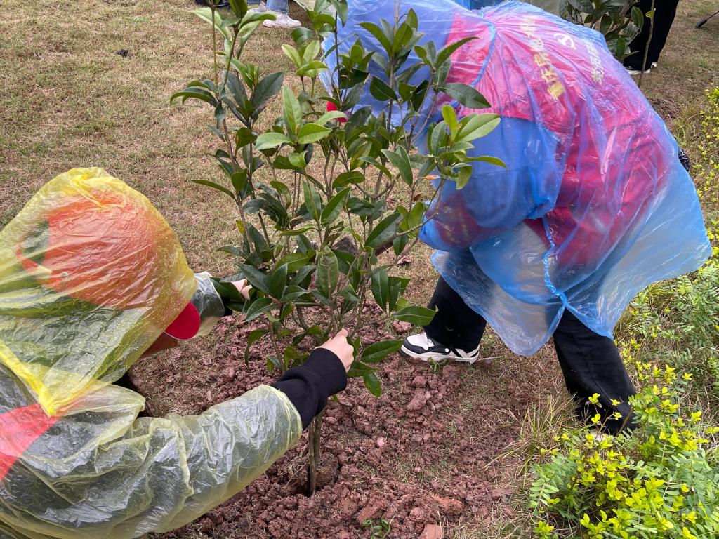 活动当日,同学们迎着春风积极参与到美化义务植树活动中。同学们热情高涨,平常连锄头都没有摸过的同学们,此刻却有板有眼地当起了“园艺工程师”。大家分工合作,有的挖坑、有的扶树苗、有的浇水……热闹的场面温馨而快乐。眨眼的功夫,在同学们的辛勤劳动下,树苗便“亭亭玉立”在沃土上。虽然大家鞋底全是泥土,但眼前这一片新生的春意让大家满心欢喜。种下的树苗在微风中摇曳,大家与小树苗进行了合影,结束了本次活动。