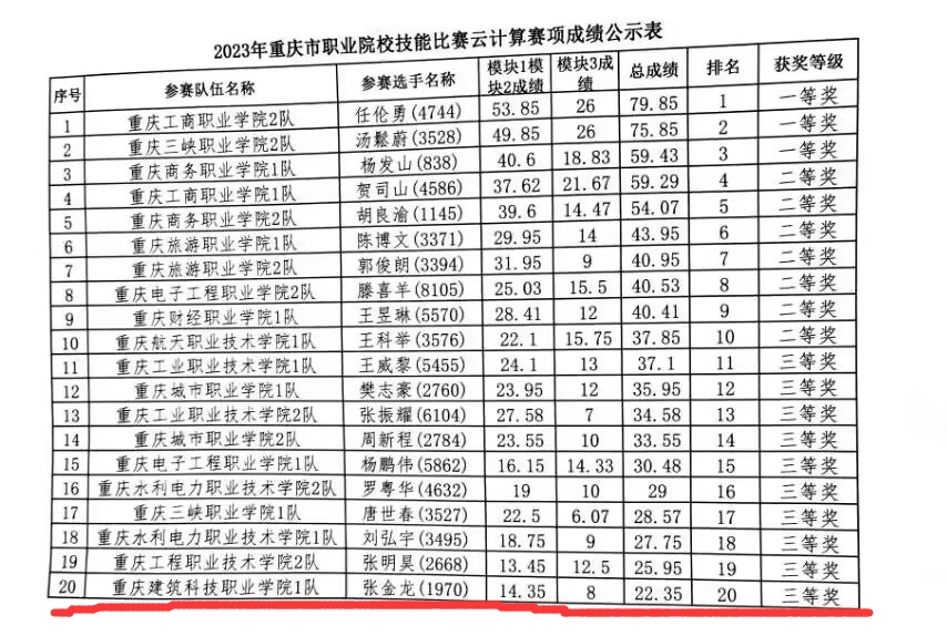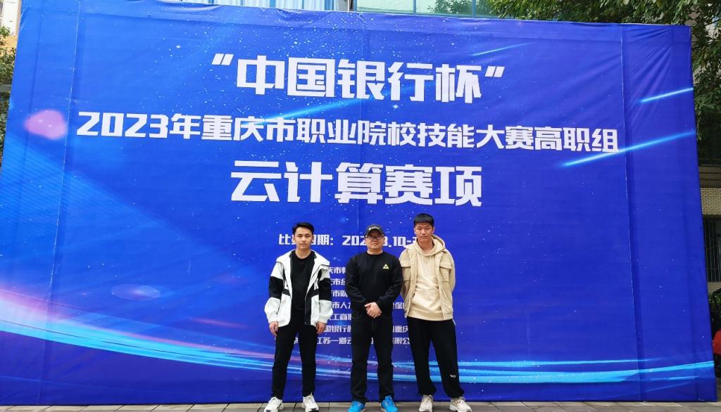 2023年3月10日11日,钟涛、卓仁前老师指导下,20级云计算技术应用二班张金龙21级云计算技术应用二班孔文浩两名同学,重庆工商职业学院举办的“中国银行杯”2023年重庆市职业院校技能大赛高职组云计算赛项中取得喜人佳绩