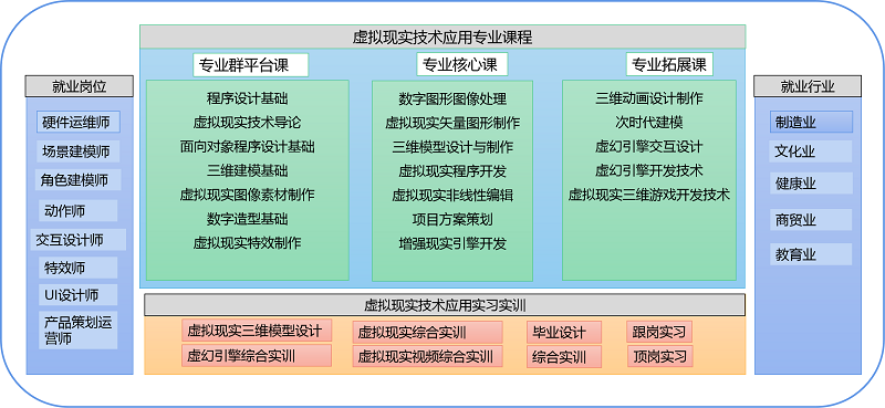 【培养目标】本专业主要培养学生掌握虚拟现实、增强现实技术相关VR美术技术、虚幻引擎制作、VR/AR产品策划、VR/AR软硬件平台搭建和维护、VR/AR产品运营与维护、全景拍摄和处理等专业知识,具备虚拟现实、增强现实项目设计与开发、模型与动画制作、软硬件平台设备搭建和调试等能力,主要面向制造、教育、文化、健康、商贸等相关行业,培育从事硬件运维师、场景建模师、角色建模师 、动作师、交互设计师、VR特效师、UI设计师、产品策划运营师岗位工作的高素质技术技能人才。本专业学生在取得学历证书的同时,可获得行业就业刚性要求的虚拟现实技术应用“1+X”证书,也是学生顺利就业的保障。