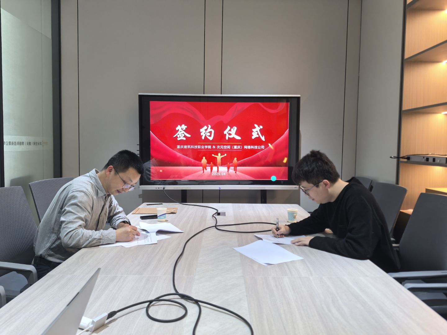 为进一步深化产教融合,推动专业数字化转型升级,4月9日,建筑科技职业学院数字艺术学院院长曾易成率建筑室内教研室教师团队再访次元空间(重庆)网络科技有限公司(以下简称“次元空间”),双方正式签订校企合作协议,并挂牌成立“产教融合实践基地”。次元空间联合创始人文怀伟、文怀俊及技术团队出席签约仪式,双方就AI技术赋能建筑室内设计、实训资源共享、人才联合培养等议题达成深度合作共识。