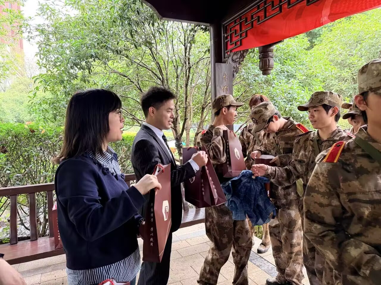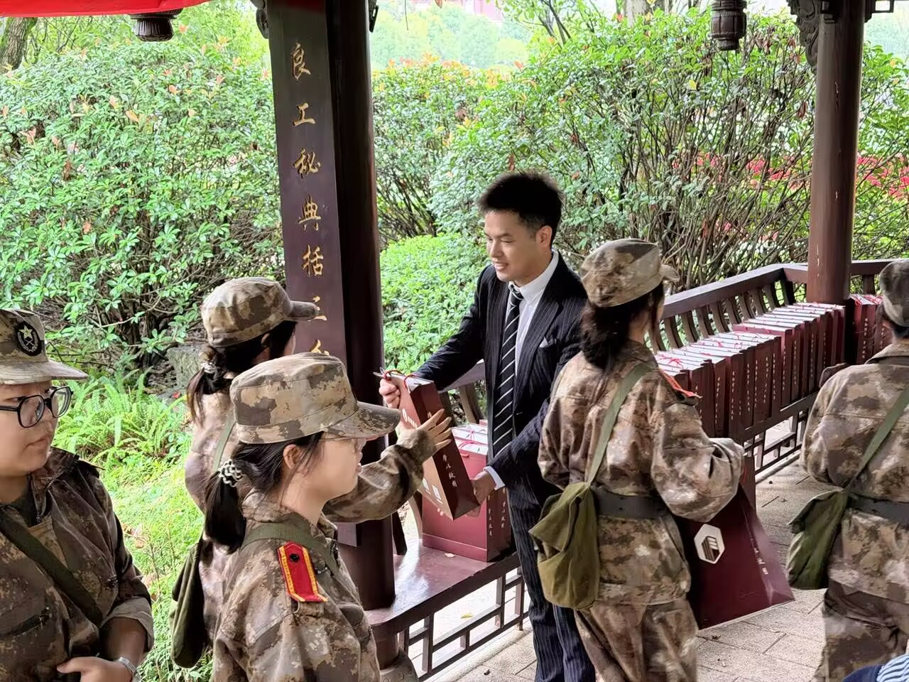 10 月 17 日上午,我院产教融合负责人钟元、辅导员陈丽,与树莓集团副总裁李佳凌、重庆校区运营经理曾一航带领的慰问团队抵达现场。彼时新生正以昂扬斗志开展队列训练,就在准备分发物资时,天空突降细雨且雨势骤增。为避免新生淋雨受凉,我院工作人员第一时间与企业团队沟通,将物资转移至附近凉亭,引导各班有序领取,确保物资高效送达每位新生手中。