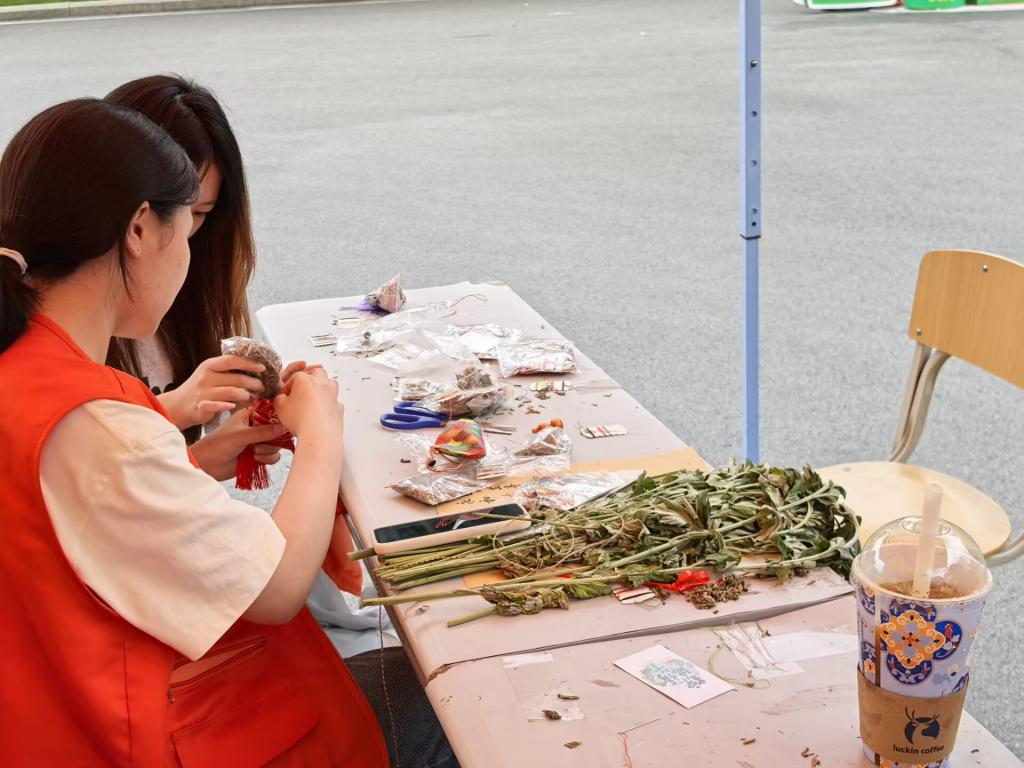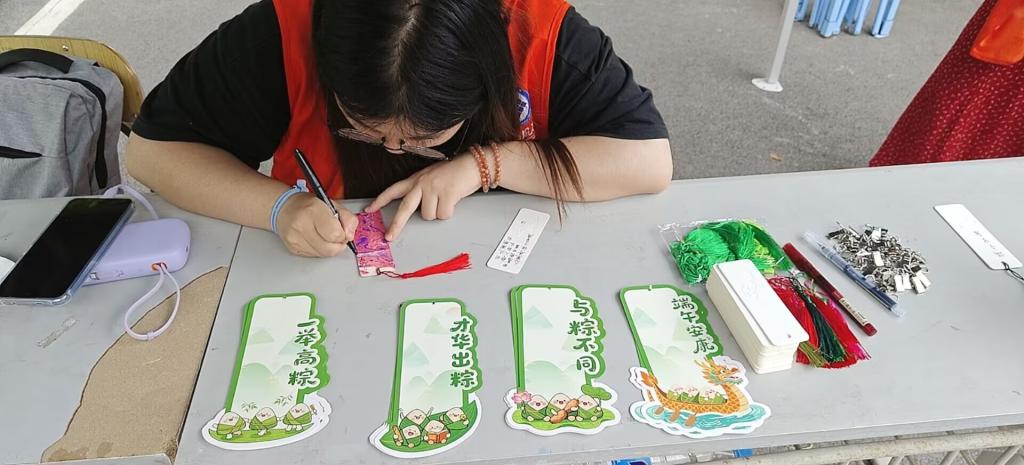 端午节是中国传统节日之一,承载着深厚的历史文化底蕴和丰富的民俗内涵。本次活动形式多样、内容丰富:有手工DIY 艾草包,提供艾草DIY材料包制作迷你粽子;手工DIY五彩绳,老师同学们可以在互动区进行手工DIY制作五彩绳手链;非遗漆扇,老师同学们准备使用提供的工具进行手工绘制非遗漆扇;创意端午书签,在带有端午特色的书签上面进行留言,完成后搭配装饰,可挂在展示墙上组成“端午祝福树”上也可以自行带走留做纪念。