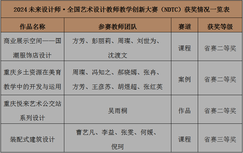 2024未来设计师·全国艺术设计教师教学创新大赛重庆省级赛奖项公布。beat365数字艺术学院教师喜获该赛事重庆赛区二等奖 3 项、三等奖 1项。