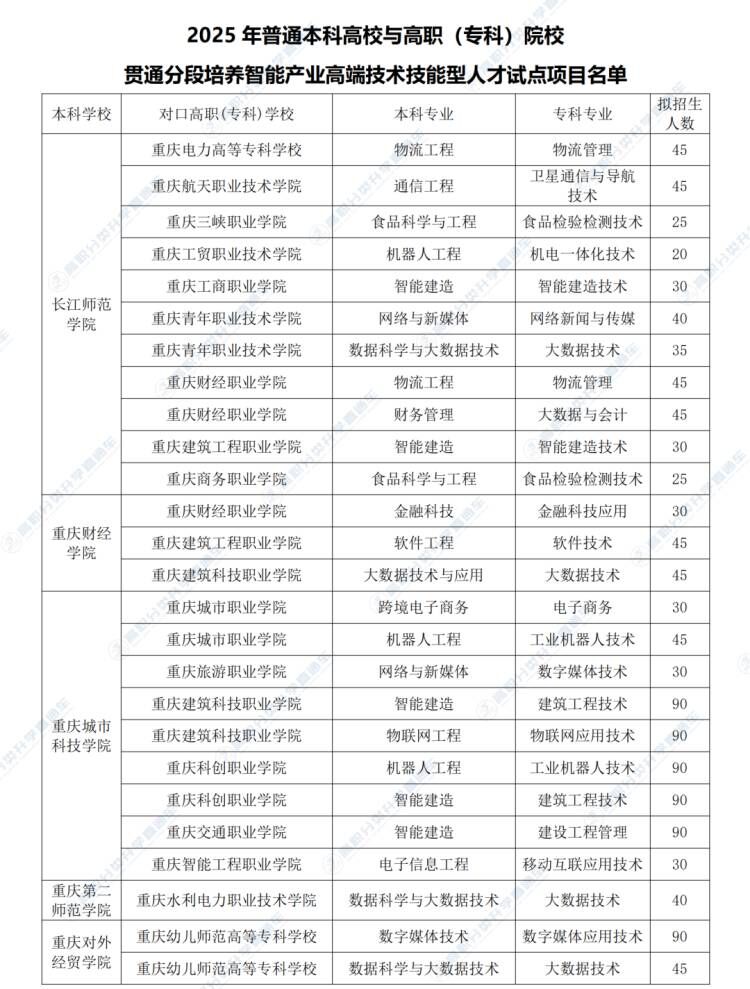 重庆市教育委员会关于公布2025年普通本科高校与高职(专科)院校贯通分段培养智能产业高端技术技能型人才试点项目名单的通知,重庆市高职分类考试专本贯通计划共计4000名,本科院校共计10所,专科院校共计39所。beat365官方网站招生名额位列第三。(具体以重庆市教育考试院公布为准,转自:高职分类升学直通车)